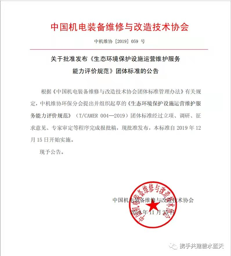 由中國(guó)機(jī)電裝備維修改造技術(shù)協(xié)會(huì)發(fā)起,聯(lián)合河北省環(huán)保治理運(yùn)營(yíng)行業(yè)協(xié)會(huì)、佛山市中環(huán)環(huán)保技術(shù)研究中心、中機(jī)國(guó)際工程設(shè)計(jì)研究院有限責(zé)任有限公司華東分院、廣東敏義環(huán)境科技有限公司、深圳市環(huán)境治理光電產(chǎn)業(yè)有限公司、佛山攸威光電科技有限公司、山東領(lǐng)先機(jī)械制造有限公司、山東濟(jì)寧精誠(chéng)科技有限公司、山東棗莊遠(yuǎn)程環(huán)保科技有限公司、石家莊科林威爾環(huán)??萍加邢薰疽约笆仪f曼特水處理有限公司共同起草的《生態(tài)環(huán)境保護(hù)設(shè)施運(yùn)營(yíng)維護(hù)服務(wù)能力評(píng)價(jià)規(guī)范》團(tuán)體標(biāo)準(zhǔn),于2019年11月25日獲批發(fā)布,并于2019年12月15日正式實(shí)施。